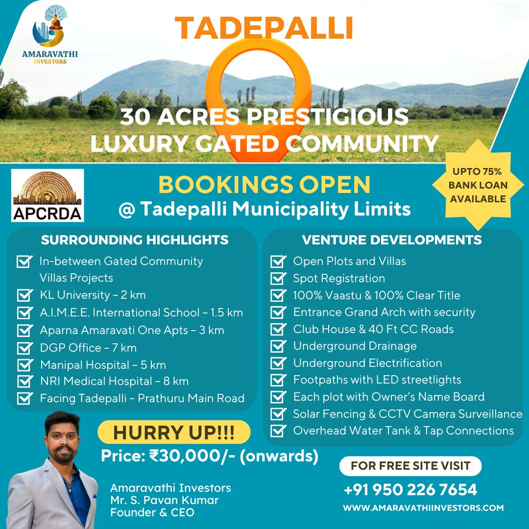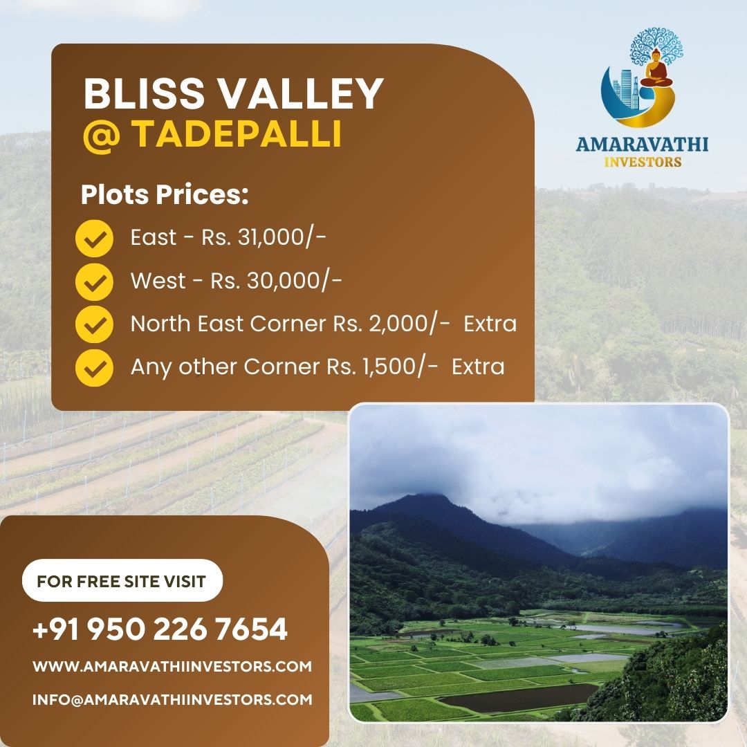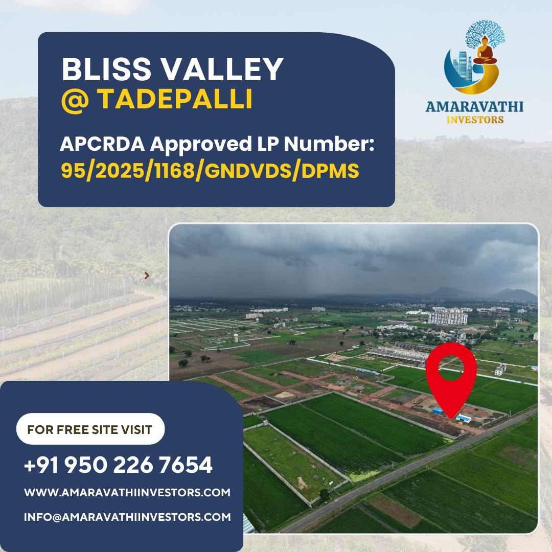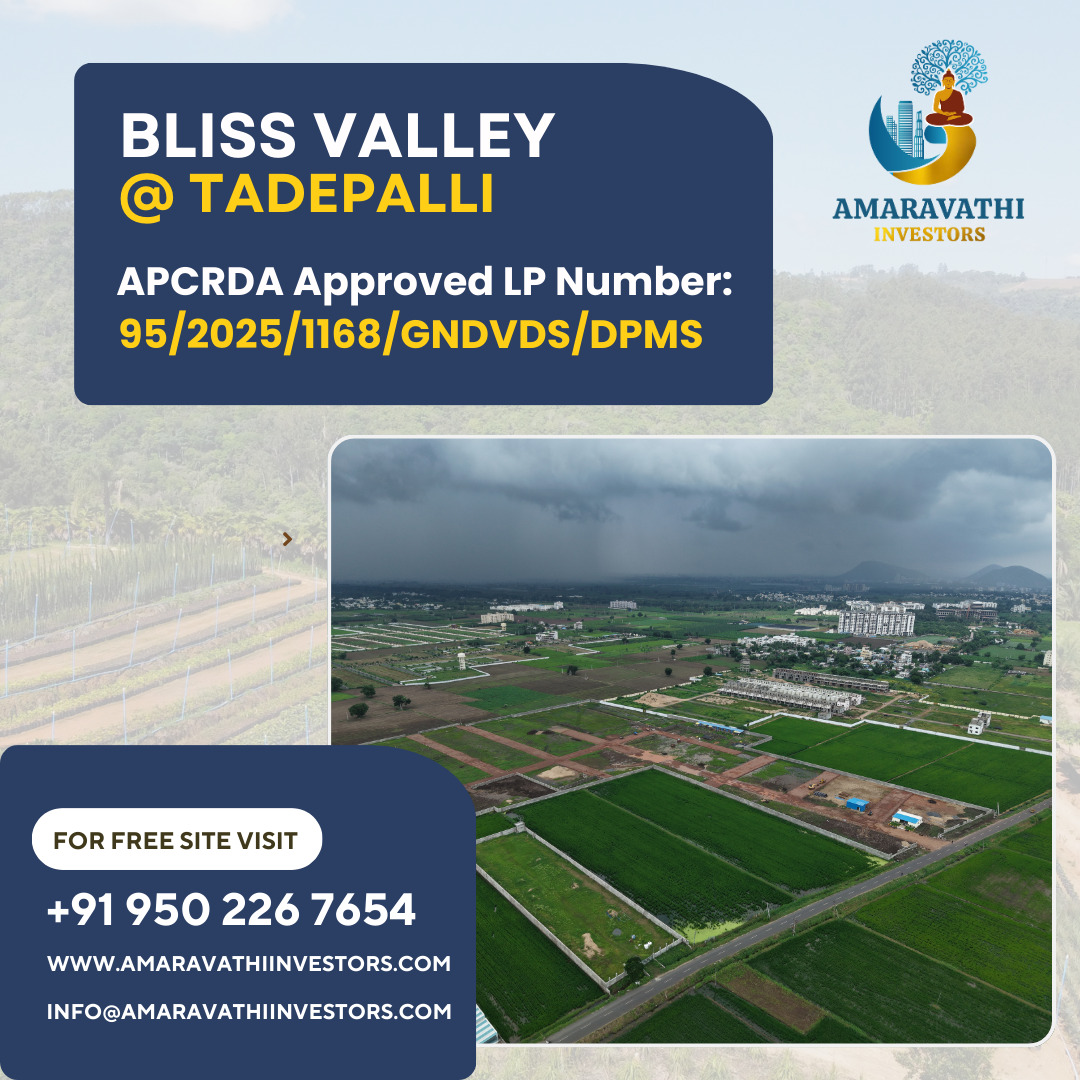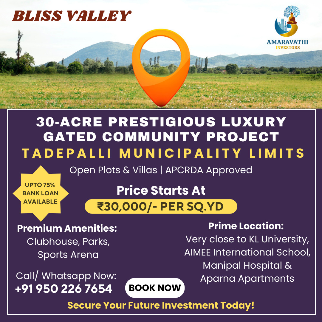BLISS Valley is an exclusive gated community located in Tadepalli Municipality, close to Amaravati Inner Ring Road. The project spans 30 acres and features both premium open plots and luxury villas. It enjoys APCRDA approval, main road access, and is surrounded by major landmarks such as AIMS Hospital, Manipal Hospital, K.L. University, AIMEE International School, and Aparna Apartments . Of its area, 25 acres are dedicated to open plots, while 5 acres are reserved for villas, making BLISS Valley a standout address for comfortable and secure community living.